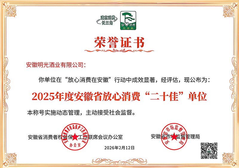 近日,安徽省消費(fèi)者權(quán)益保護(hù)工作聯(lián)席會(huì)議辦公室、省市場(chǎng)監(jiān)管局聯(lián)合公布2025年度安徽省放心消費(fèi)“二十佳”及優(yōu)秀單位名單,明光酒業(yè)從全省范圍內(nèi)近百家參與單位中脫穎而出,以第三名佳績(jī)獲評(píng)2025年度安徽省放心消費(fèi)“二十佳”單位。