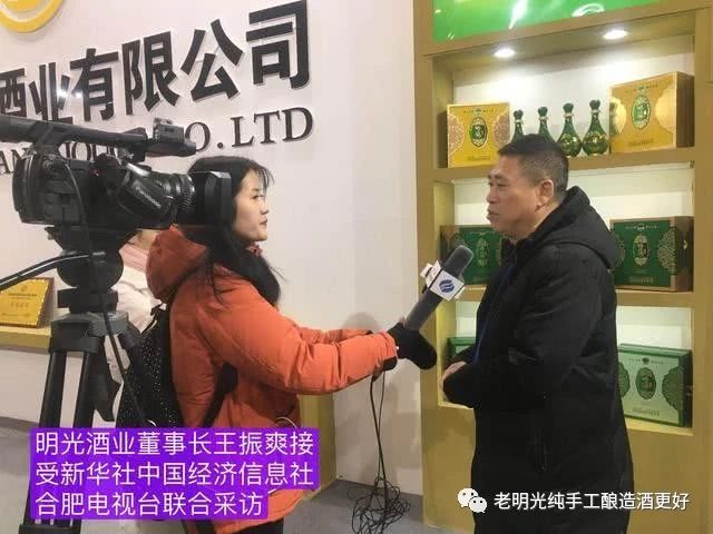 在明酒展廳內,明光酒業董事長王振爽、明酒銷售公司總經理劉邦、銷售公司黨支部書記錢軍等先后接受了新浪、今日頭條、安徽電視臺、合肥電視臺、新華社中國經濟信息社等媒體采訪。