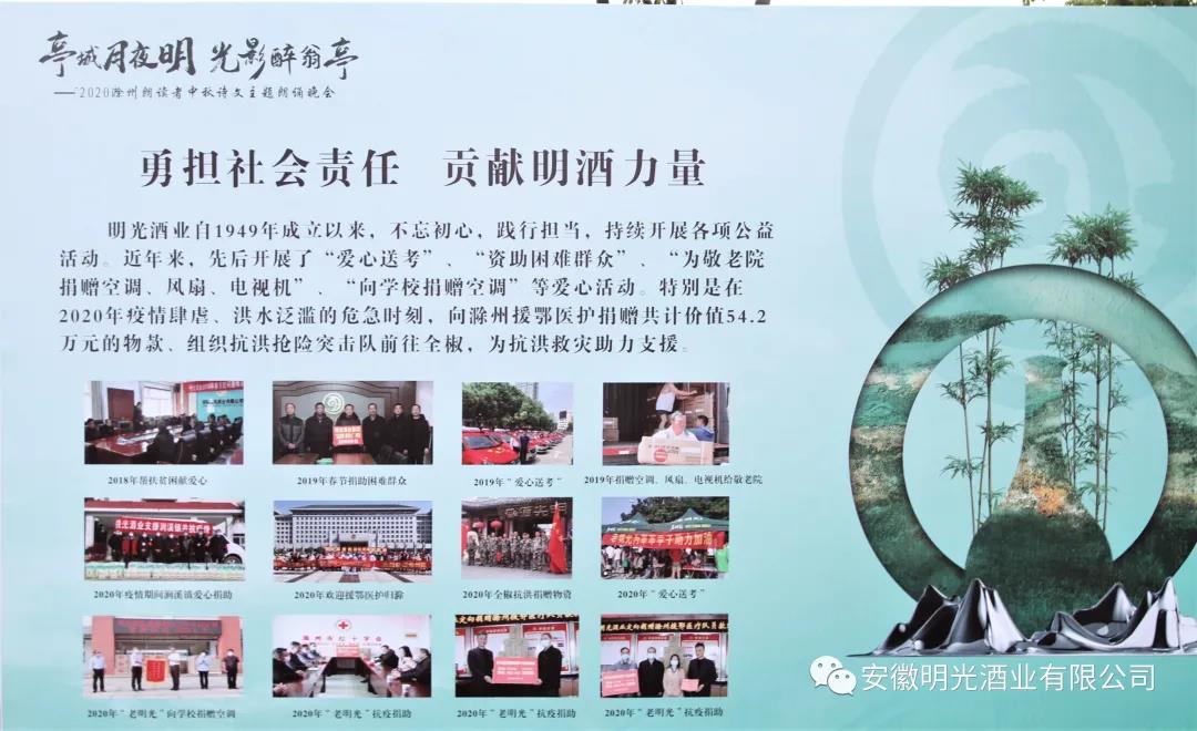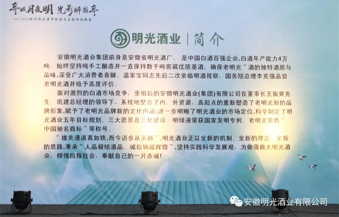 作為一家具有70余年歷史的企業,明光酒業一直熱衷于公益事業。身為2020滁州朗讀者中秋詩文主題朗誦晚會的協辦者,安徽明光酒業有限公司特別參與了第三篇章“月下酌吟”的朗誦,展示了作品《明光酒賦》和《明光月 明光酒》。