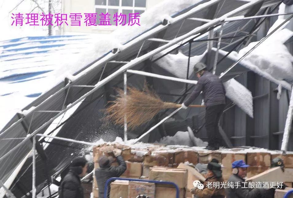 新年元旦剛過,十年未遇的特大雪災(zāi)降臨皖東,明光酒業(yè)各部門迅速反應(yīng),公司總經(jīng)理鞏建召開部門負(fù)責(zé)人緊急會議。針對災(zāi)情做出部署。提出:先社會、后企業(yè),先大家,后小家。突出重點:一是104國道積雪清理,保暢通;二是倉庫物質(zhì)轉(zhuǎn)運(yùn);三是車棚內(nèi)車輛移位;四是公司內(nèi)外樹木減負(fù)保護(hù);五是公司內(nèi)部道路清理。災(zāi)情就是命令,連日來,明光酒業(yè)數(shù)百人的抗災(zāi)救援隊伍,演繹了明酒雪中情。